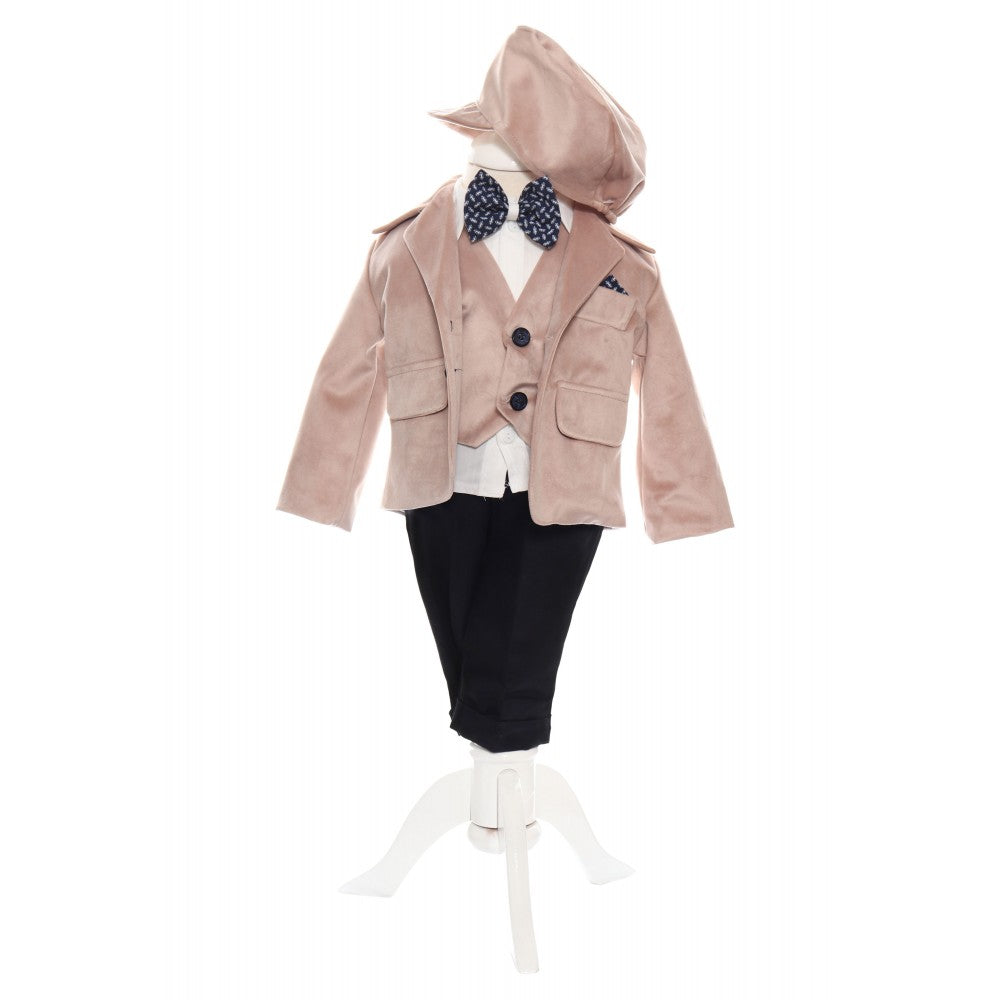 Costum�crem alcatuit din 5 piese: camasa cu vesta aplicata, papion, pantaloni, sacou si bascuta.Camasa alba cu vesta aplicata este confectionata din bumbac. Se incheie cu nasturi si poate fi purtata si in combinatie cu alte haine.Papionul�este un accesoriu elegant si necesar care completeaza intreaga tinuta.Sacoul din catifea este o piesa vestimentara importanta care scoate in evidenta outfit-ul. Se inchide cu nasturi, iar buzunarele sunt doar cu rol estetic.Pantalonii se potrivesc perfect cu sacoul. Se muleaza perfect pe corpul oricarui baietel, deoarece sunt prevazuti cu elastic in talie.Bascuta este un accesoriu indispensabil si este realizata din acelasi material cu sacoul.Intregul costum este realizat in Romania.