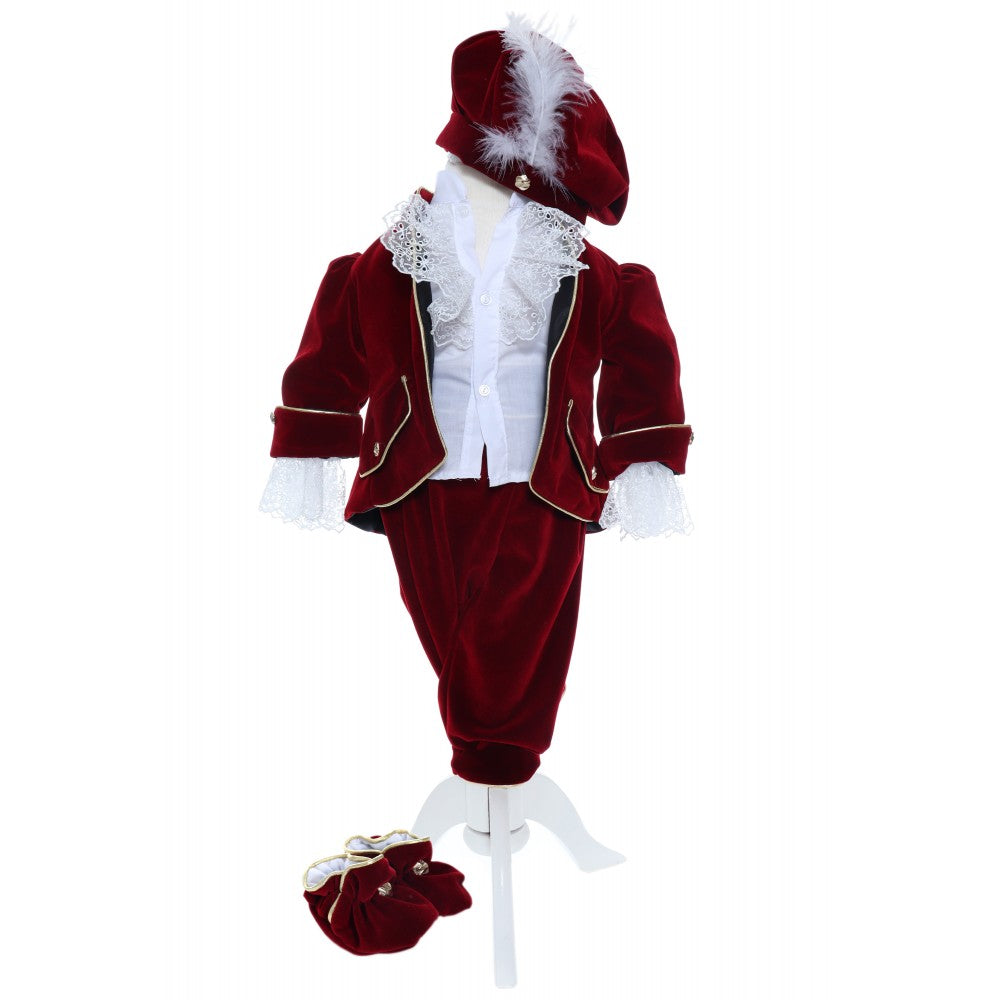 Costum din catifea visiniu, Micul Print, pentru botez, 5 piese, camasa, sacou, pantaloni, palarie si botosei pentru baieti, REC2280