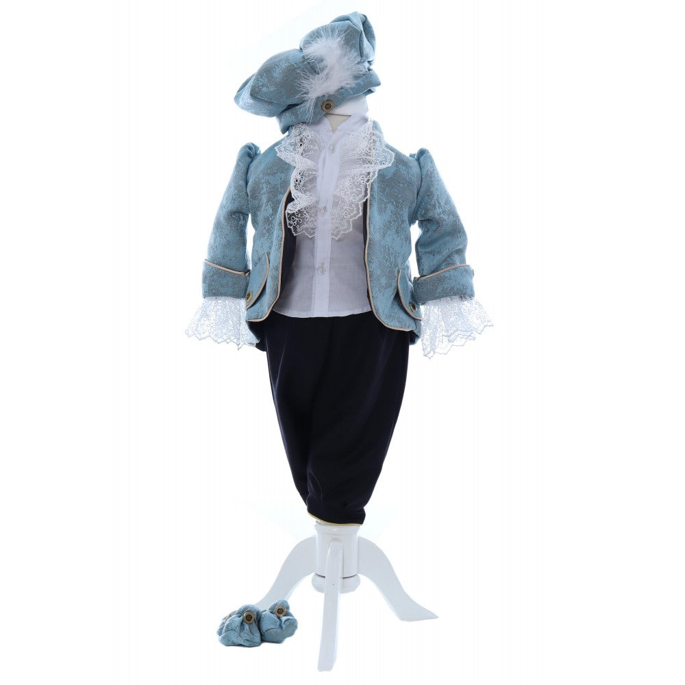 Acest costum rafinat este alcatuit dintr-un sacou, pantaloni, o camasa, o basca si o pereche de botosei asortati, oferindu-i micutului tau un aspect impecabil si distins.