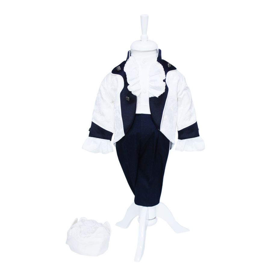 Camasa alba cu detalii din dantela este foarte eleganta si este confectionata din bumbac. Se incheie cu capse/nasturi si poate fi purtata la oricare alta tinuta, pentru ca este versatila.Sacoul alb, brocard este rafinat si nu este prevazut cu sistem de inchidere. Este foarte elegant si este potrivit pentru evenimente speciale.Pantalonii sunt confectionati din bumbac si poliester. Se muleaza perfect pe corpul oricarui baietel si sunt usor de imbracat, deoarece sunt prevazuti cu elastic in talie.Palaria este un accesoriu indispensabil si elegant care completeaza tinuta si ii da un aer aristocrat.Costumul poate fi purtat la orice ocazie speciala cum ar fi botez sau orice eveniment important.Intregul costum este realizat in Romania de catre cei mai iscusiti croitori.