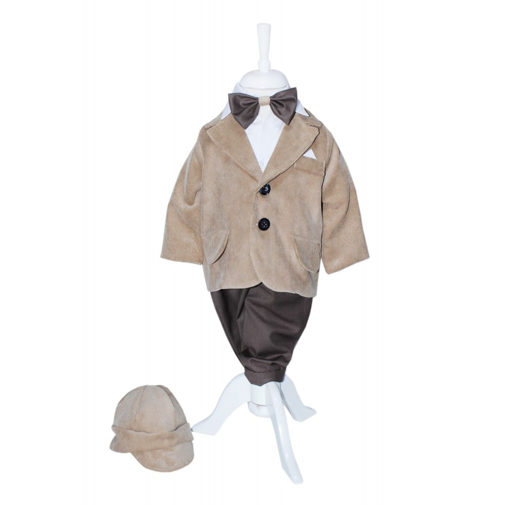 Costum crem-maro alcatuit din 5 piese: camasa, papion, pantaloni, sacou si bascuta.