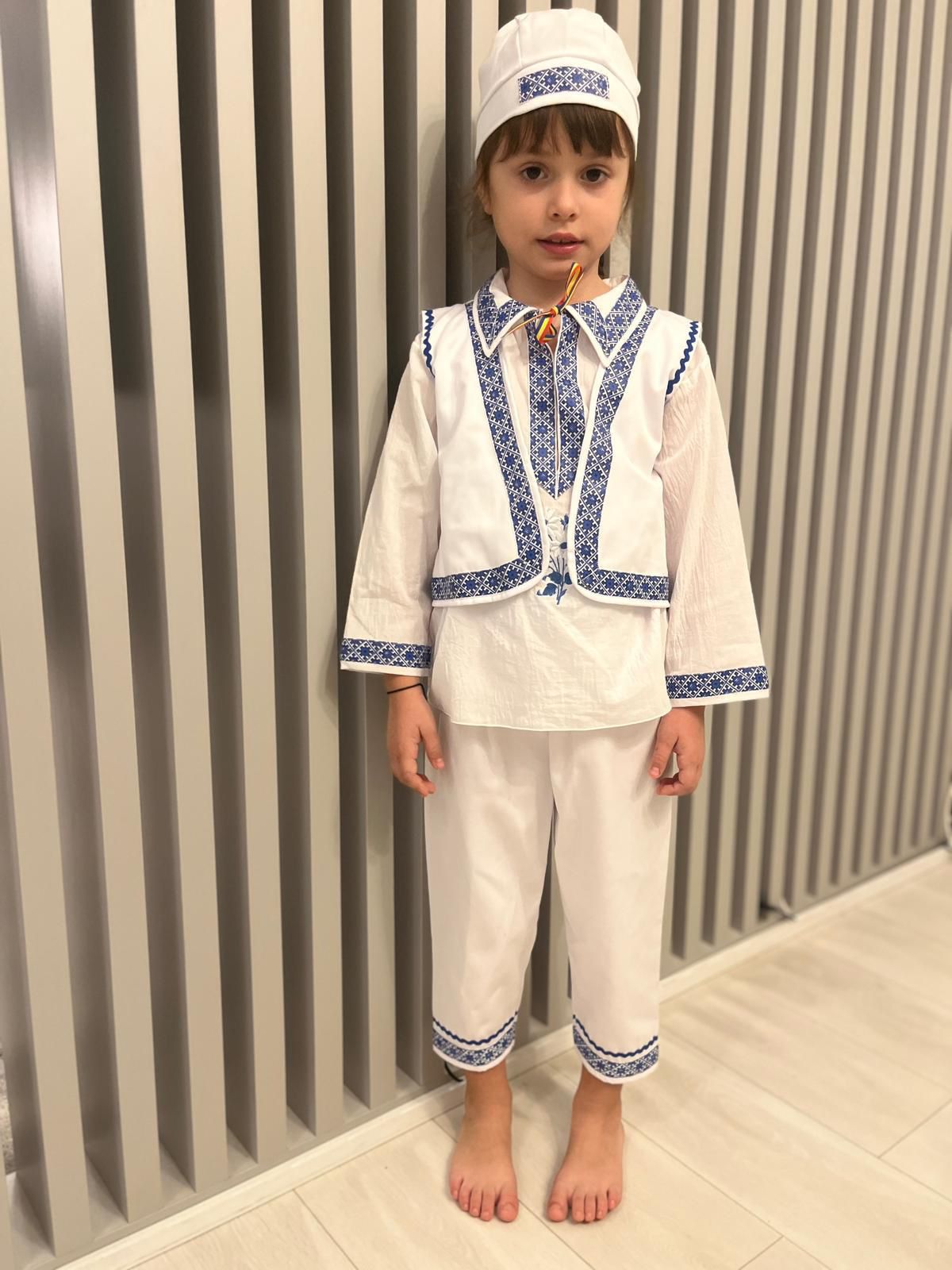 Camasa de culoare alb-albastru este realizata din bumbac 100% si este prevazuta cu motive traditionale. Este versatila si poate fi purtata si in combinatie cu alte haine.Pantalonii albi cu motive traditionale sunt prevazuti elastic in talie si se muleaza perfect pe talia baietelului.Vesta completeaza intreaga tinuta.� Nu este prevazuta cu sistem de inchidere.Caciulita este simpla si are rolul de a proteja capul fragil al bebelusului.Costumul popular poate fi purtat la orice ocazie speciala cum ar fi botez sau orice alt eveniment.Intregul costum popular este realizat in Romania.