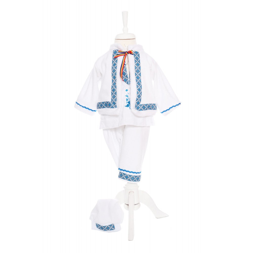 Costum popular alb-albastru alcatuit din 4 piese: haina groasa, camasa, pantaloni si caciulita. Haina alba cu motive traditionale este confectionata din material cocolino si se incheie cu un snur tricolor.Camasa este brodata cu flori albastre si este confectionata din bumbac.Pantalonii se potrivesc perfect cu haina. Se muleaza pe corpul oricarui baietel, deoarece sunt prevazuti cu elastic in talie.Caciulita completeaza tinuta si in acelasi timp protejeaza capul delicat al bebelusului.Potrivit pentru sezonul rece.Intregul costum este realizat in Romania.