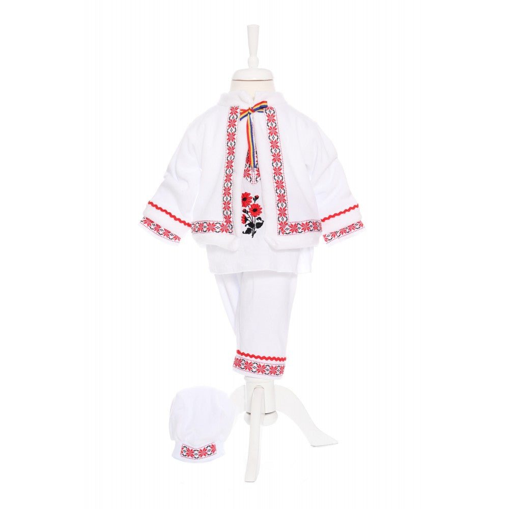 Costum popular alb-rosu alcatuit din 4 piese: haina groasa, camasa, pantaloni si caciulita. Haina alba cu motive traditionale este confectionata din material cocolino si se incheie cu un snur tricolor.Camasa este brodata cu flori rosii si este confectionata din bumbac.Pantalonii se potrivesc perfect cu haina. Se muleaza pe corpul oricarui baietel, deoarece sunt prevazuti cu elastic in talie.Caciulita completeaza tinuta si in acelasi timp protejeaza capul delicat al bebelusului.Potrivit pentru sezonul rece.Intregul costum este realizat in Romania.