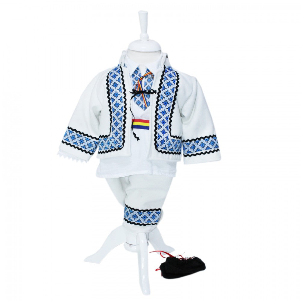 Pantalonii de culoare alba cu motive traditionale sunt realizati din acelasi material cu bluza. Se muleaza perfect pe corpul oricarui baietel, deoarece sunt prevazuti cu elastic in talie.