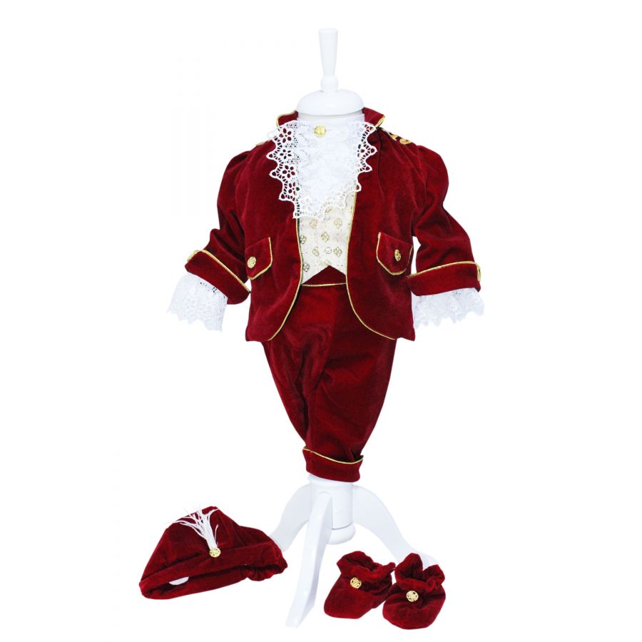 DESCRIERECamasa alba cu detalii din dantela si vesta aplicata este foarte eleganta si este confectionata din bumbac si poliester. Se incheie cu capse si poate fi purtata la oricare alta tinuta, pentru ca este versatila.Sacoul visiniu, din catifea, cu detalii aurii are rol estetic si nu este prevazut cu sistem de inchidere. Este foarte elegant si este potrivit pentru evenimente speciale.Pantalonii visinii sunt confectionti din acelasi material din care a fost realizat sacoul. Se muleaza perfect pe corpul oricarui baietel, deoarece sunt prevazuti cu elastic in talie.Palaria este un accesoriu elegant care completeaza tinuta. Pana si banutul auriu sunt detalii care infrumuseteaza obiectul vestimentar.Botosii se asorteaza perfect cu intregul outfit. Sunt delicati si raman fixati in piciorusul copilului cu ajutorul elasticului.Costumul poate fi purtat la orice ocazie speciala din primul an de viata al bebelusului.