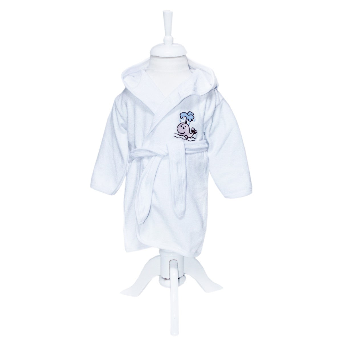 Halat alb de baie cu gluga si cordon alb in jurul taliei, perfect pentru a imbraca bebelusul dupa baita. Acesta il va adora si se va simti confortabil in noul sau halat. Desenul brodat poate sa difere.