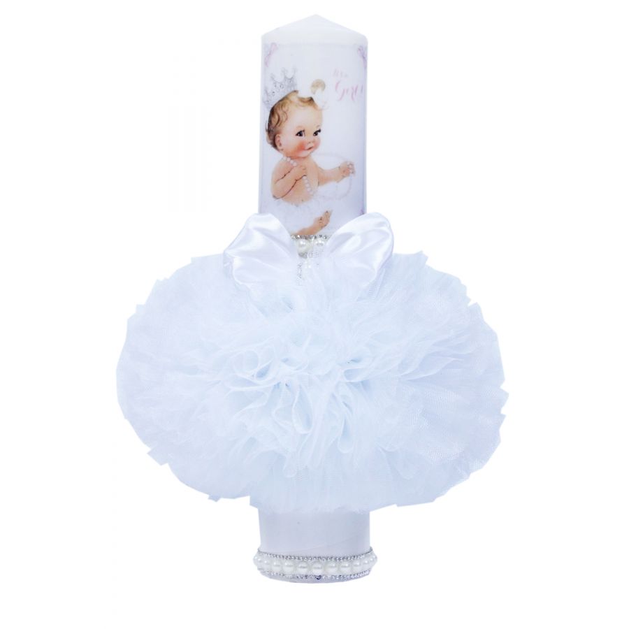 Lumanarea pentru botez este confectionata din ceara alba si este accesorizata cu tulle alb, incretit, funda alba, perle si bebe printesa imprimata. Dimensiunile aproximative sunt: 35 cm lungime si diamentrul de 7 cm.