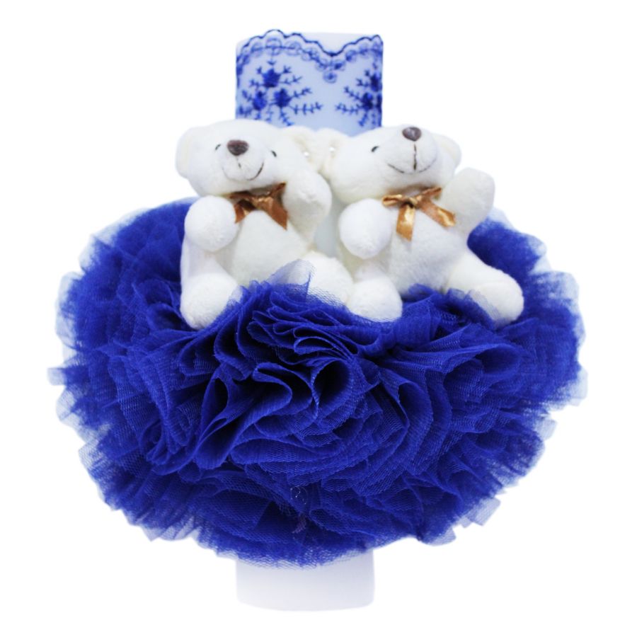Lumanarea pentru botez este confectionata din ceara alba si este accesorizata cu tulle albastru, incretit, broderie in aceeasi nunata si doi ursuleti. Ursuletii de plus sunt detasabili si pot ramane amintire bebelusului, pentru a crea impreuna momente frumoase. Dimensiunile aproximative sunt: 20 cm lungime si diamentrul de 7 cm.