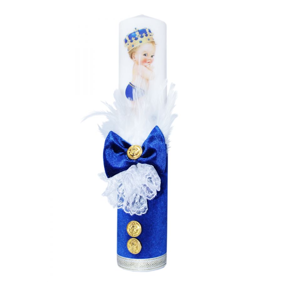 Lumanarea pentru botez este confectionata din ceara alba si este accesorizata cu pene albe, catifea albastra, banuti aurii, bebe print imprimat si funda. Dimensiunile aproximative sunt: 40 cm lungime si diamentrul de 7 cm.