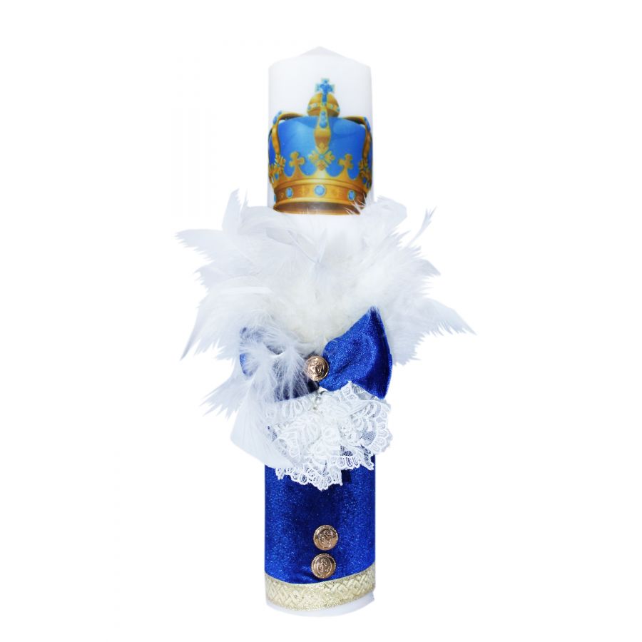 Lumanarea pentru botez este confectionata din ceara alba si este accesorizata cu pene albe, catifea albastra, banuti aurii, coroana de print imprimata si funda. Dimensiunile aproximative sunt: 40 cm lungime si diamentrul de 7 cm.