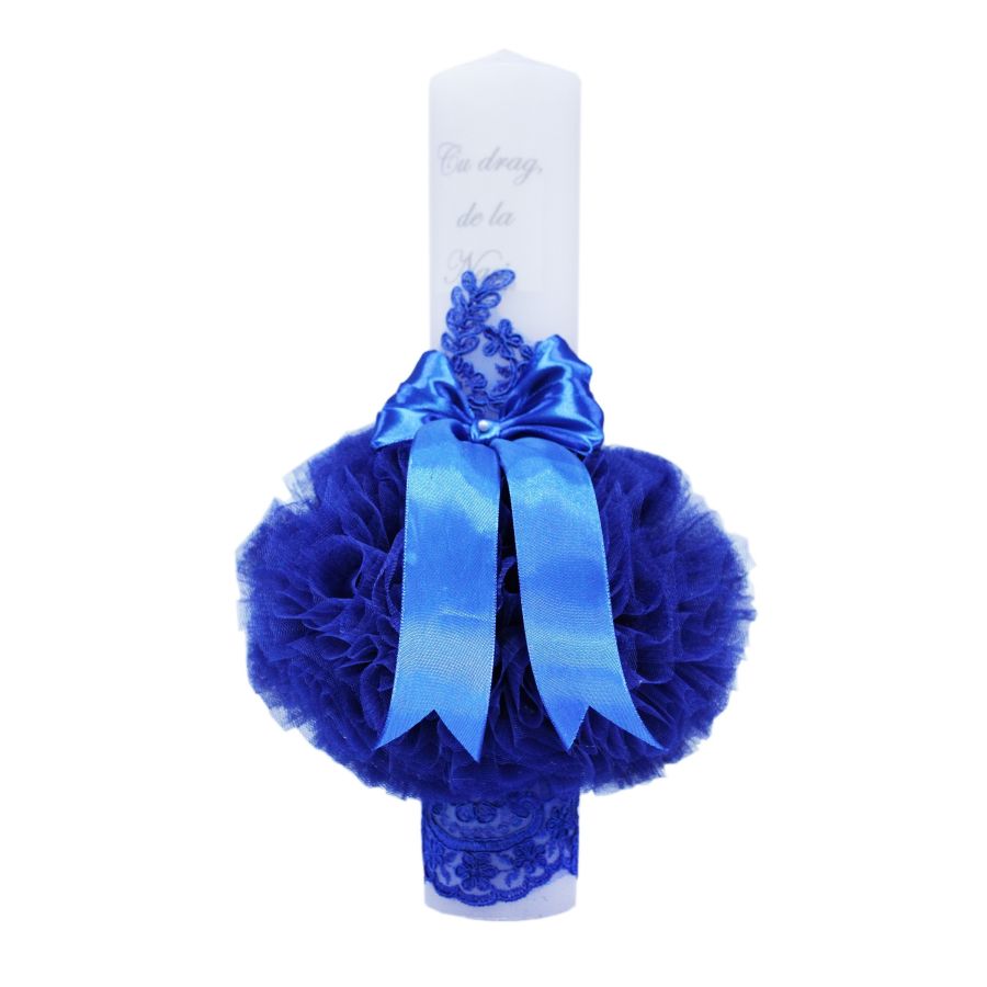 Lumanarea pentru botez este confectionata din ceara alba si este accesorizata cu tulle albastru electric, incretit, funda mare albastra, broderie in acceasi culoare si mesaj imprimat �Cu drag, de la Nasi�. Dimensiunile aproximative sunt: 40 cm lungime si diamentrul de 7 cm.
