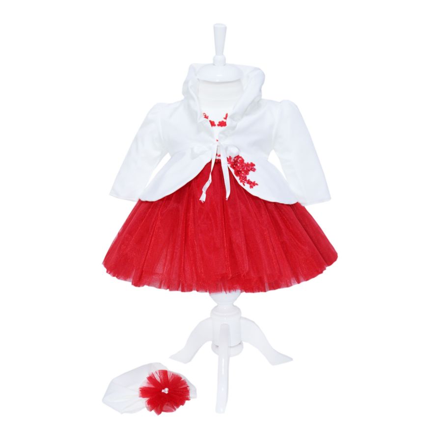 Rochie alb-rosu pentru botez, 4 piese, rochita, bolero, turban, pantaloni pentru fetite, REC1169