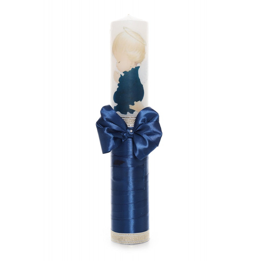 Lumanarea pentru botez este confectionata din ceara alba si este accesorizata cu panglica bleumarin, papion si ingeras aplicat.