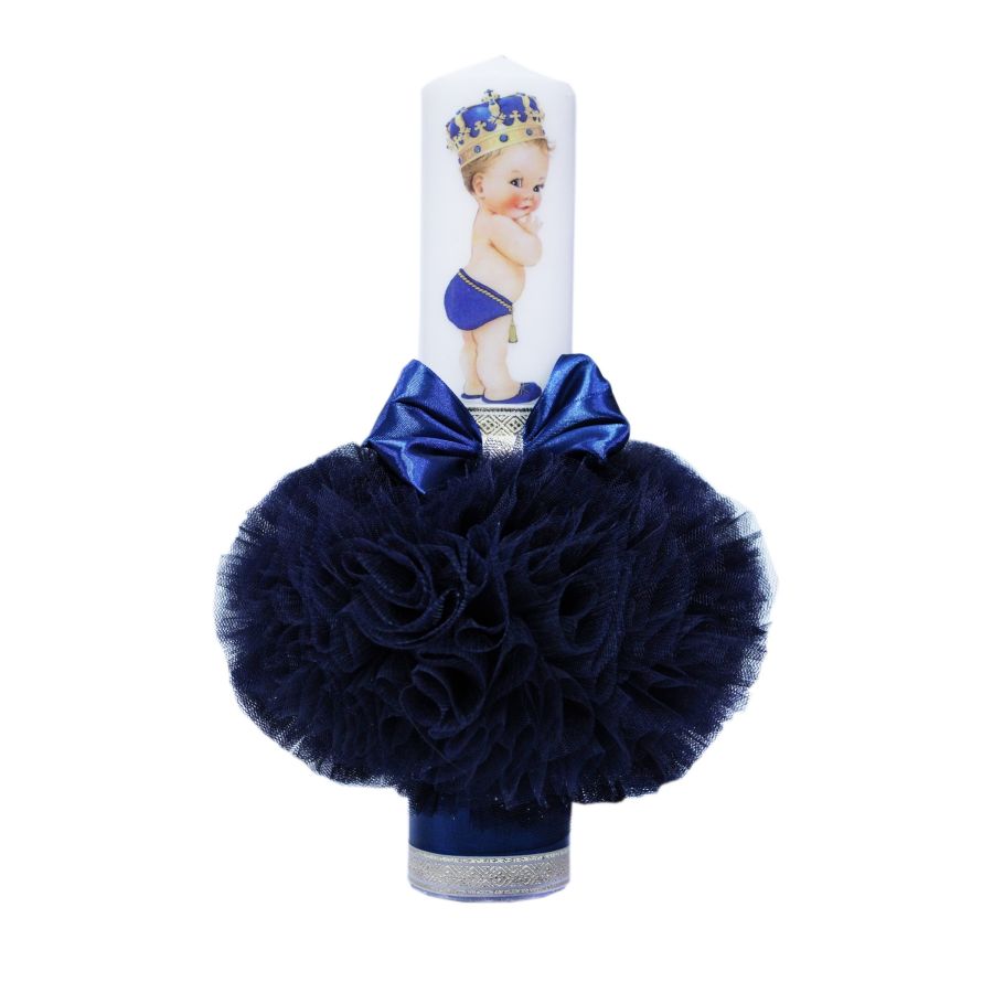 Lumanarea pentru botez este confectionata din ceara alba si este accesorizata cu tulle bleumarin, incretit, funda bleumarin, panglica bleumarin, detalii aurii si bebe print imprimat. Dimensiunile aproximative sunt: 35 cm lungime si diamentrul de 7 cm.