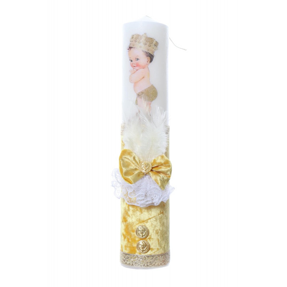 Lumanare botez accesorizata cu catifea galbena si bebe print, 35 cm, Recostore, REC2177