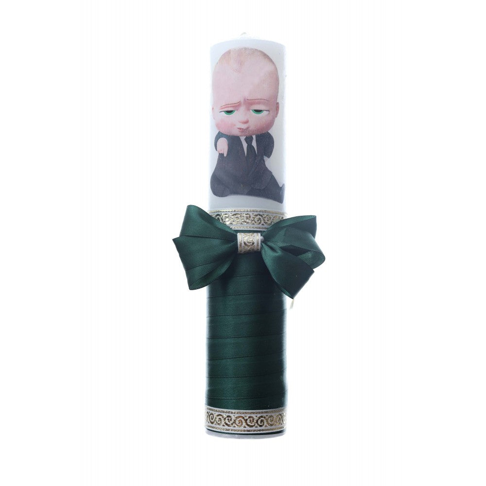 Lumanarea cu�Bebe Boss pentru botez este confectionata din ceara alba si este accesorizata cu panglica�verde si fundita.Dimensiunile sunt urmatoarele:Lumanare: 30 cm inaltime, 6 cm diametru