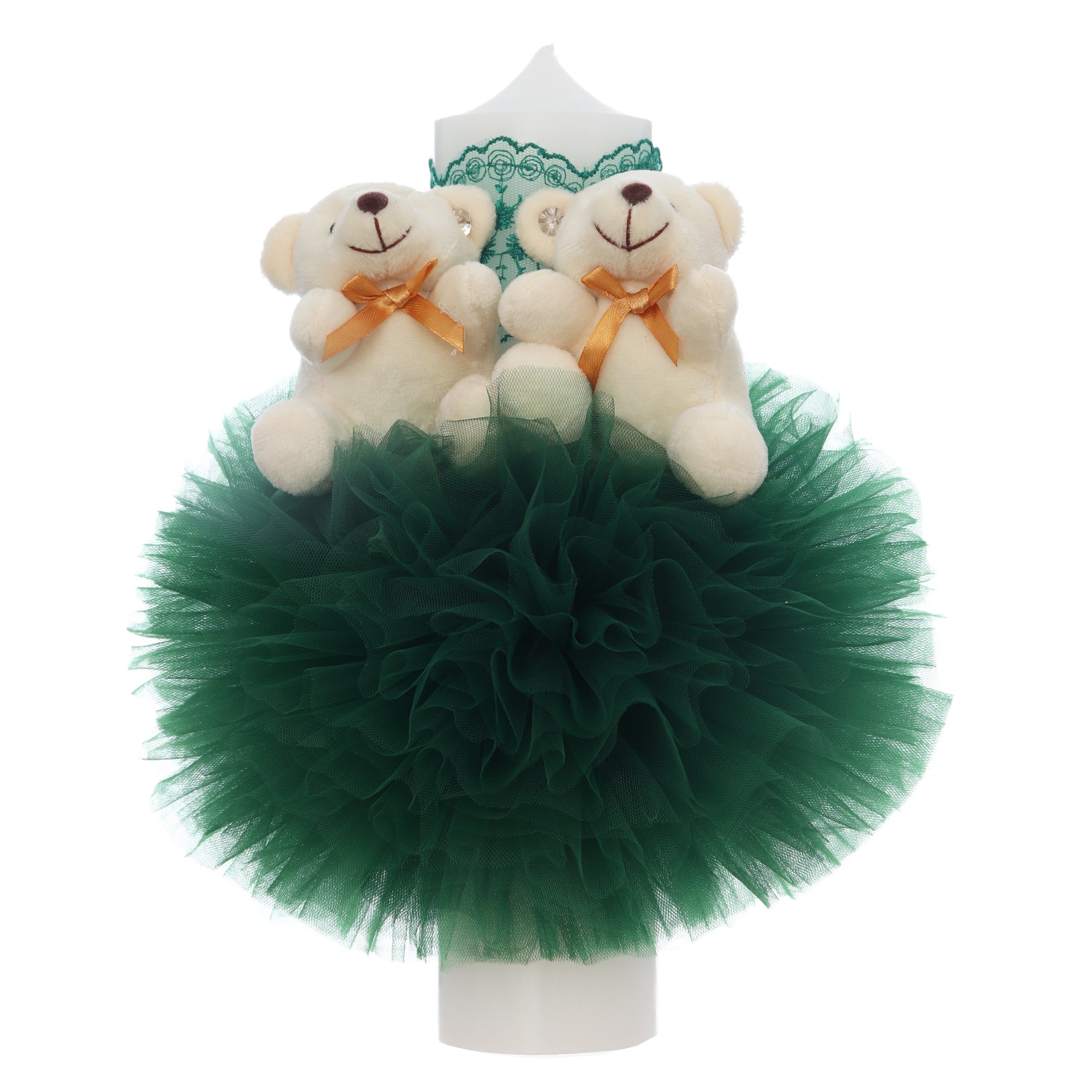 Aceasta lumanare de botez delicata si eleganta, decorata cu doi ursuleti de plus dantela si tul verde, este o alegere fermecatoare pentru un eveniment special.