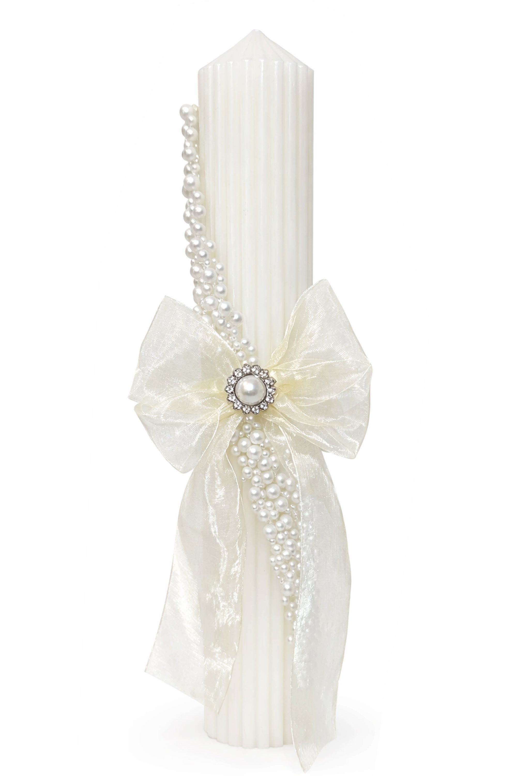 Lumanarea de botez canelata, accesorizata cu fundita si perle este alegerea perfecta pentru a aduce o nota de eleganta si delicatete ceremoniei de botez. Cu dimensiuni de 35x6 cm, aceasta lumanare este atent lucrata pentru a oferi un aspect rafinat si sofisticat.