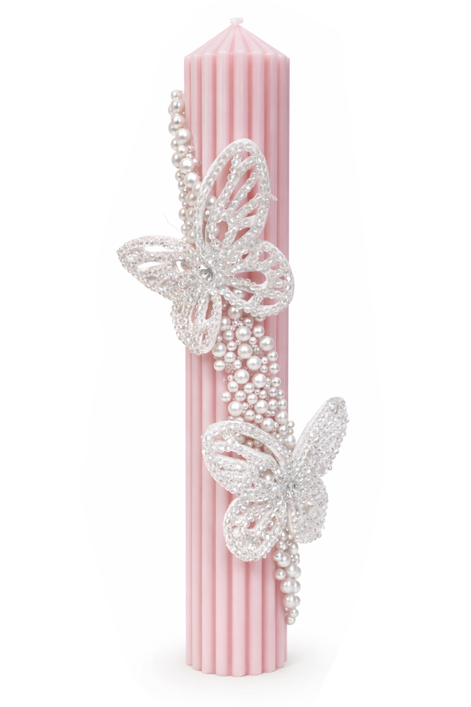 Lumanarea de botez canelata, accesorizata cu fluturi si perle este alegerea perfecta pentru a aduce o nota de eleganta si delicatete ceremoniei de botez. Cu dimensiuni de 35x6 cm, aceasta lumanare este atent lucrata pentru a oferi un aspect rafinat si sofisticat.