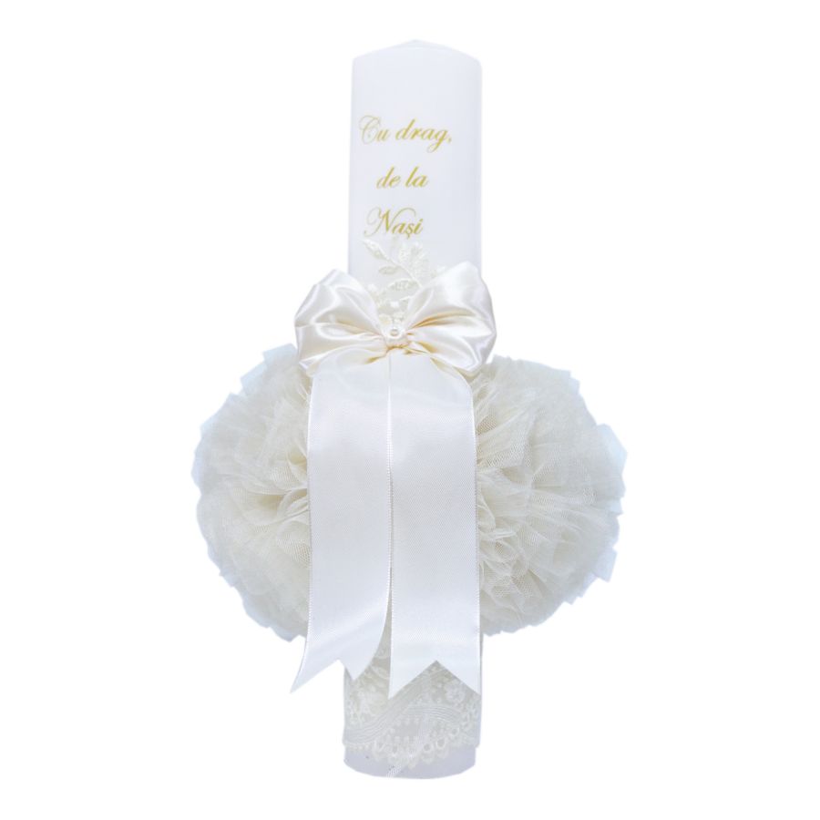 Lumanarea pentru botez este confectionata din ceara alba si este accesorizata cu tulle ivoire, incretit, funda mare ivoire, broderie ivoire si mesaj imprimat �Cu drag, de la Nasi�. Dimensiunile aproximative sunt: 40 cm lungime si diamentrul de 7 cm.