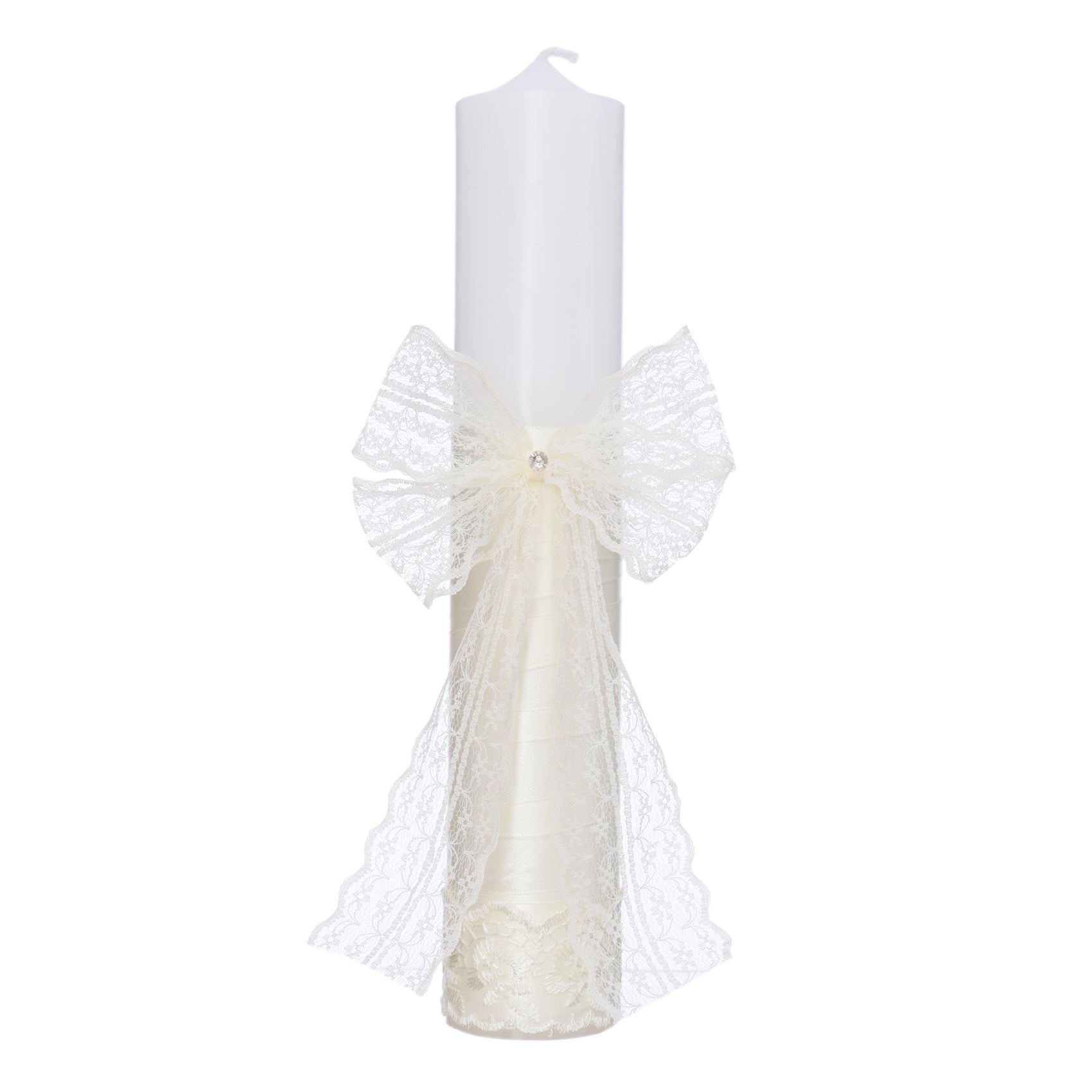 Aceasta lumanare de botez eleganta este decorata cu fundita fina din dantela, perfect pentru o ceremonie plina de emotie si semnificatie.