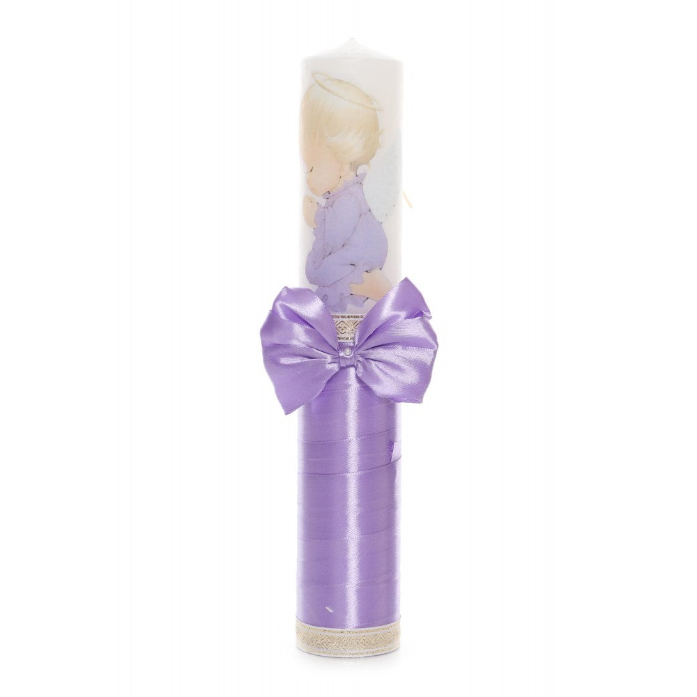 Lumanarea pentru botez este confectionata din ceara alba si este accesorizata cu panglica lila, papion si ingeras aplicat.
