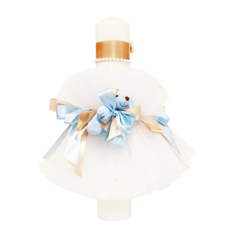 Lumanarea pentru botez este confectionata din ceara alba si este accesorizata cu tulle alb tip fusta, fundita bleu si ursulet de plus.