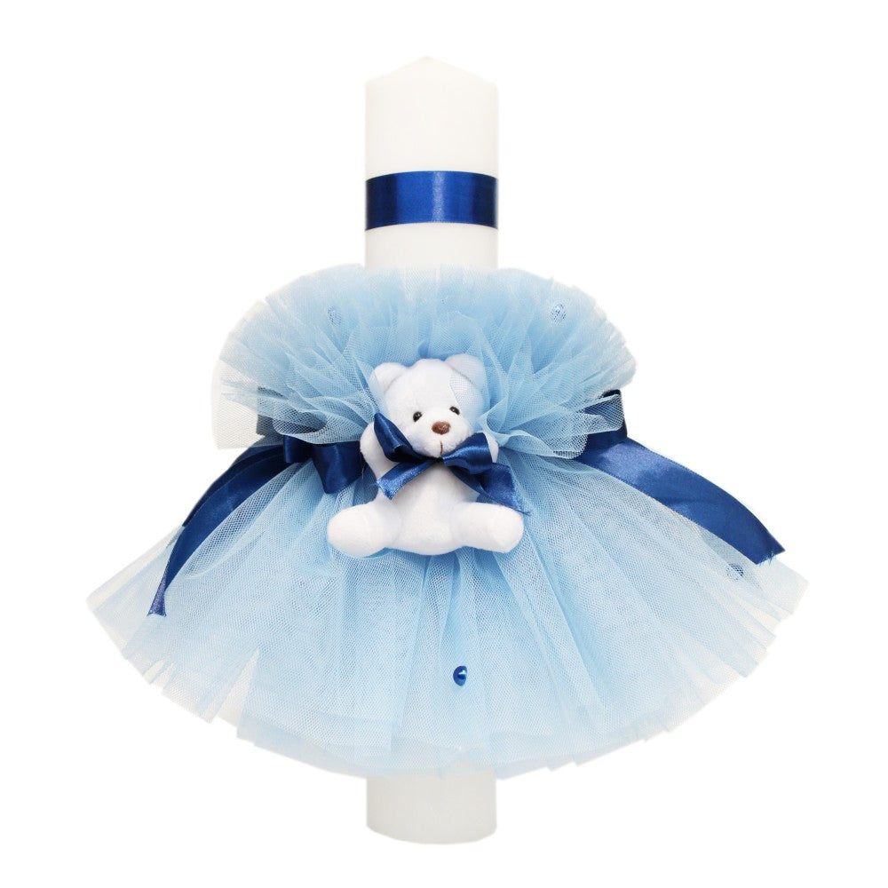 Lumanarea pentru botez este confectionata din ceara alba si este accesorizata cu tulle bleu tip fusta, fundita bleumarin si ursulet de plus.
