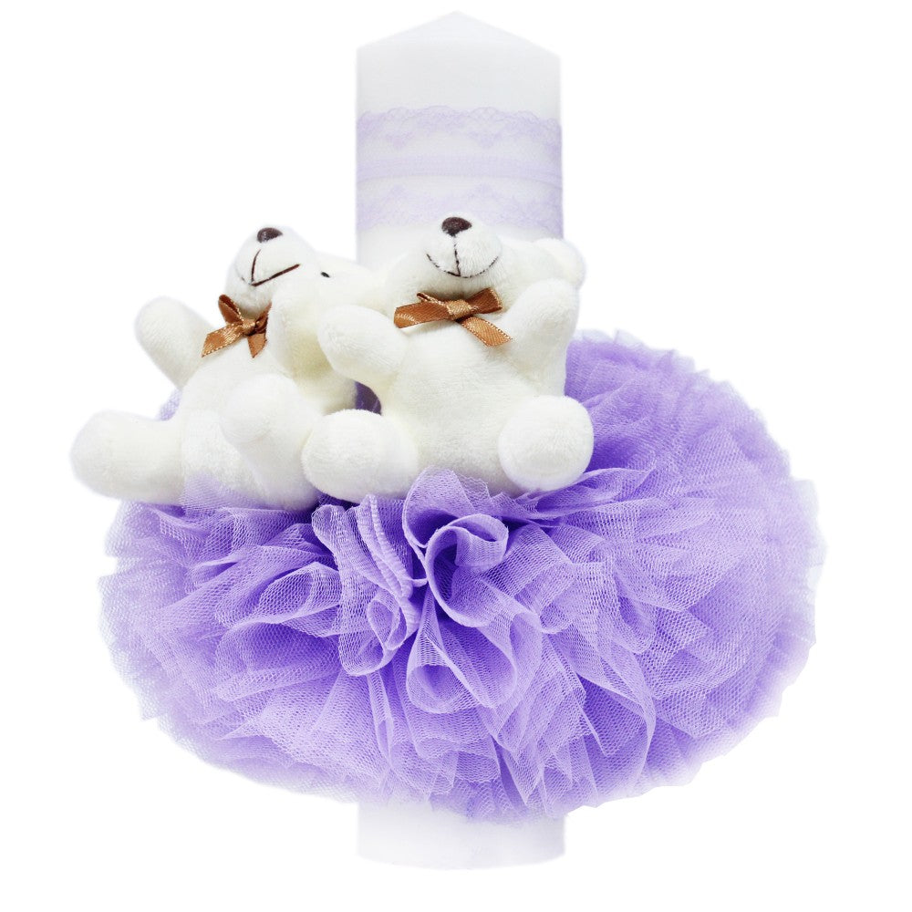 Lumanarea pentru botez este confectionata din ceara alba si este accesorizata cu tulle lila, incretit, broderie in aceeasi nuanta si doi ursuleti. Ursuletii de plus sunt detasabili si pot ramane amintire bebelusului, pentru a crea impreuna momente frumoase. Dimensiunile aproximative sunt: 20 cm lungime si diamentrul de 7 cm.
