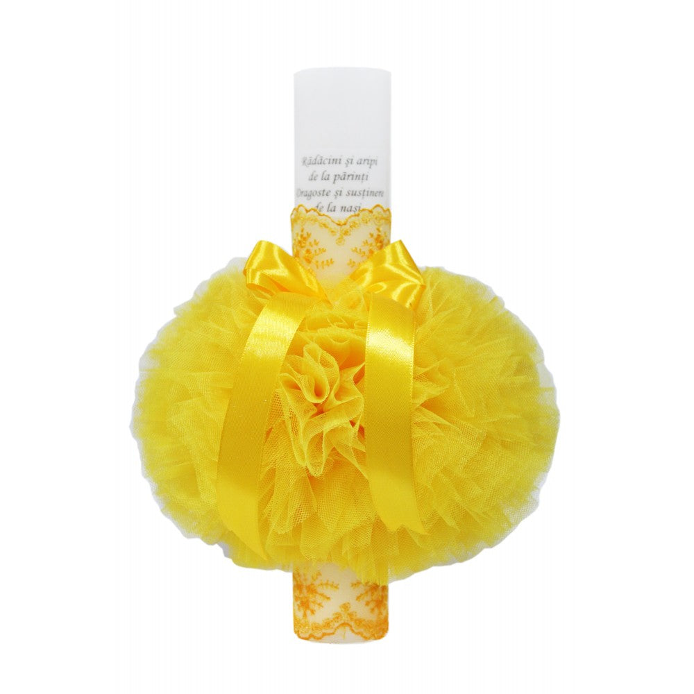 Lumanarea pentru botez este confectionata din ceara alba si este accesorizata cu tulle galben, incretit, funda mare galbena, broderie in aceeasi nuanta si mesaj imprimat �Radacini si aripi de la parinti/ Dragoste si sustinere de la nasi�.