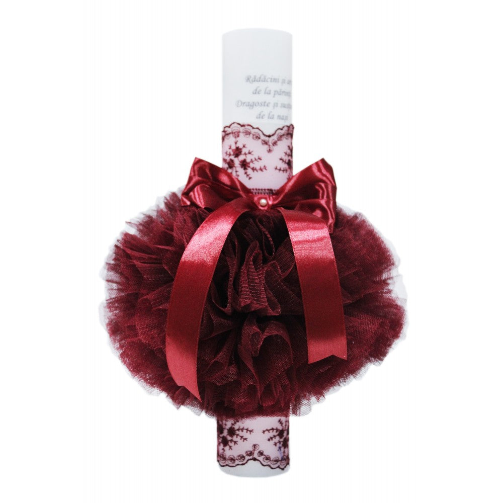 Lumanarea pentru botez este confectionata din ceara alba si este accesorizata cu tulle visiniu incretit, funda mare visinie, broderie in aceeasi nuanta si mesaj imprimat �Radacini si aripi de la parinti/Dragoste si sustinere de la nasi�.