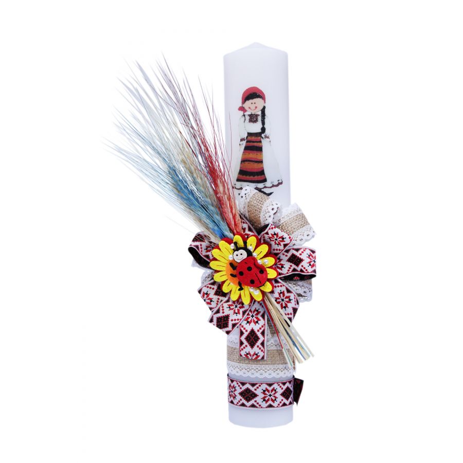 Lumanarea pentru botez este confectionata din ceara alba si este accesorizata cu spice de grau colorate, panglici cu motive traditionale, imprimeu tarancuta si aplicatii decorative. Dimensiunile aproximative sunt: 35 cm lungime si diamentrul de 5 cm