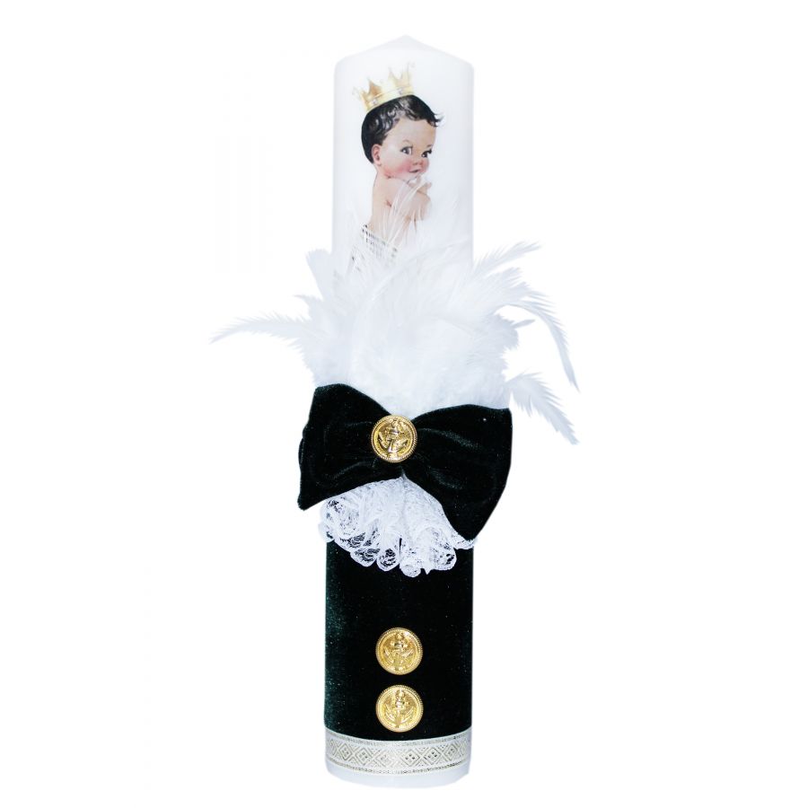 Lumanarea pentru botez este confectionata din ceara alba si este accesorizata cu pene albe, catifea verde, banuti aurii, bebe print imprimat si funda. Dimensiunile aproximative sunt: 40 cm lungime si diamentrul de 7 cm.