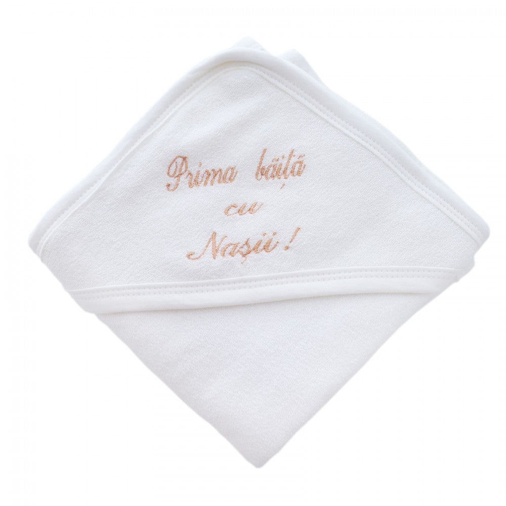 Un detaliu special este mesajul "Prima Baita�cu Nasii", care adauga un element de amintire si bucurie acestui prosop. Acest mesaj subliniaza un moment unic in viata micutului tau si aminteste de legatura speciala cu nasii.