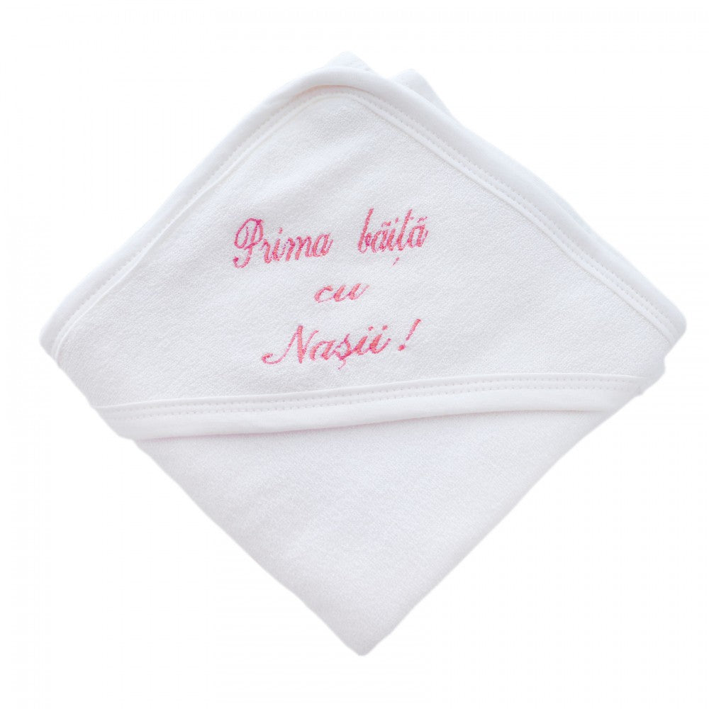 Un detaliu special este mesajul "Prima Baita�cu Nasii", care adauga un element de amintire si bucurie acestui prosop. Acest mesaj subliniaza un moment unic in viata micutului tau si aminteste de legatura speciala cu nasii.