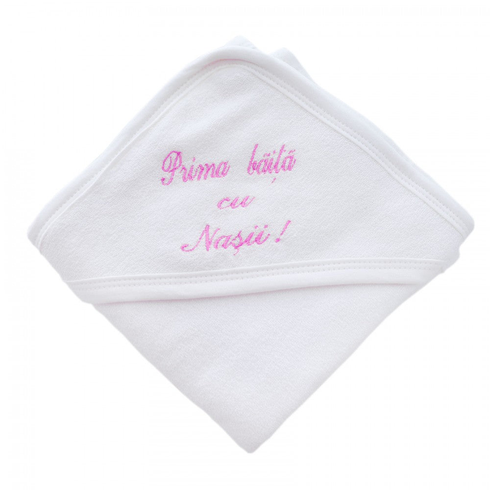 Prosop alb-roz "Prima baita cu nasii" cu capison pentru bebelusi, 75x75 cm, REC2452