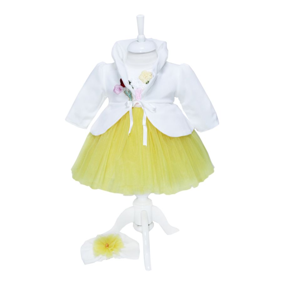 Rochie alb-galben pentru botez, 4 piese, rochita, bolero, turban, pantaloni pentru fetite, REC1166