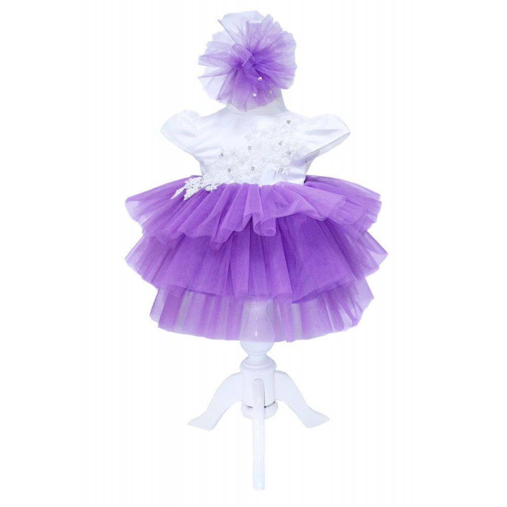 Este o rochie diafana cu aer cochet si are ca sistem de inchidere fermoar la spate. Rochia are maneca scurta fiind perfecta pentru sezonul cald.Bentita este un accesoriu indispensabil oricarei domnisoare si este asortata cu rochia.Rochia este una de efect si poate fi purtata la orice ocazie speciala cum ar fi botez sau eveniment important.Setul este realizat in Romania de catre cei mai iscusiti croitori.