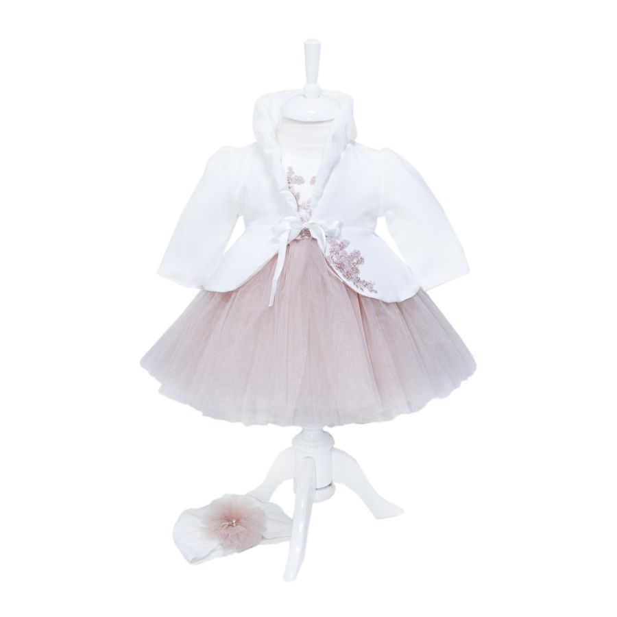Rochie alb-roz pudrat pentru botez, 4 piese, rochie, bolero, turban, pantaloni pentru fetite, REC1165