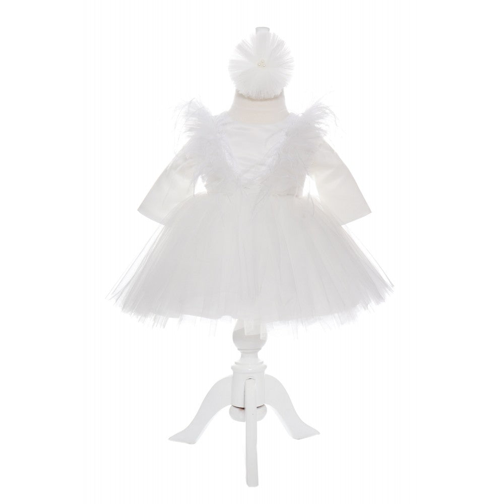 Rochie alba cu pene pentru botez, 2 piese, rochie si bentita, Recostore, REC1693