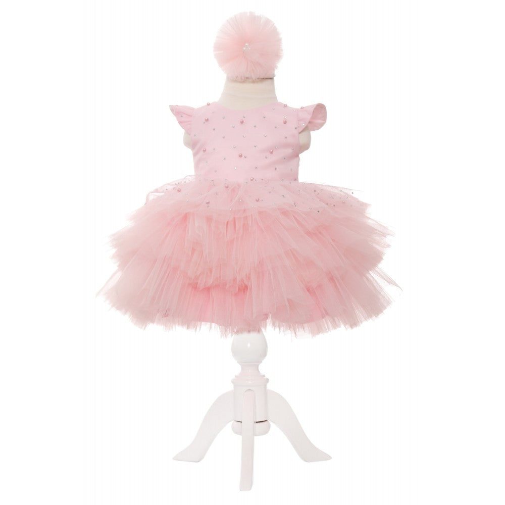 Rochia roz� pentru fetite este confectionata din satin si tulle la exterior si dublata cu bumbac la interior pentru protejarea pielii fine a bebelusului.