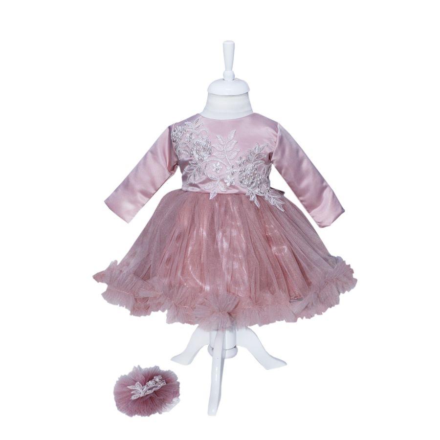 Rochie roz pudrat confectionata dintr-un material lucios, satinat in partea de sus si tulle in partea de jos. Este accesorizata cu broderie si perlute. Sistem de inchidere cu fermoar la spate.Bentita este un accesoriu indispensabil oricarei domnisoare si este asortata cu rochia.Rochia este una de efect si poate fi purtata la orice ocazie speciala cum ar fi botez sau orice alt eveniment important.Produs in Romania de catre cei mai iscusiti croitori.
