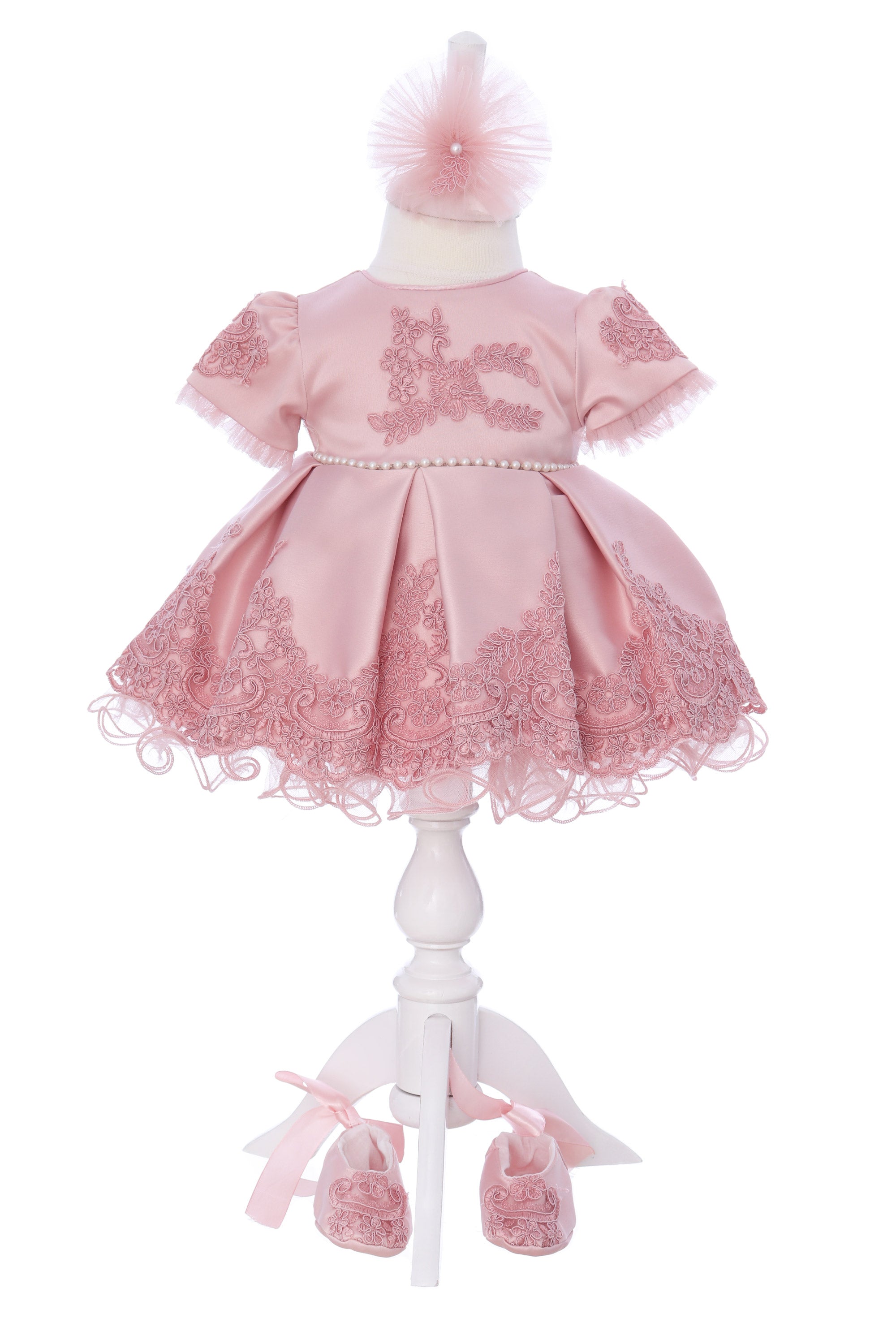 Rochie eleganta cu maneca scurta pentru botez fetita, 3 piese, rochie, bentita si botosei, REC3298