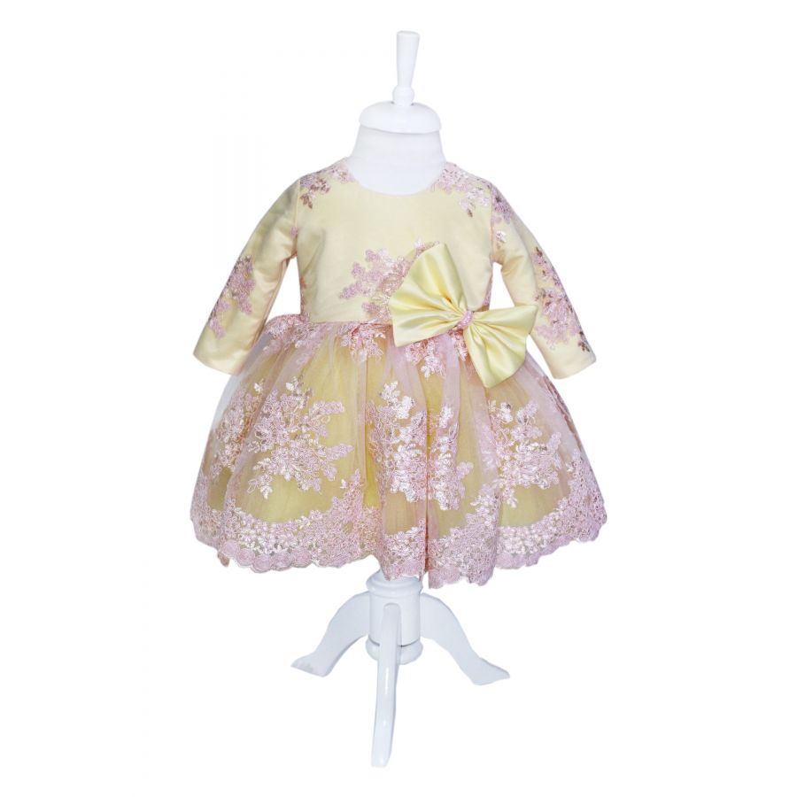 Rochia pentru fetite este eleganta si rafinata potrivita pentru orice eveniment important din viata fetitei dumneavoastra. Este confectionata din material satinat si tulle fin acoperite cu broderie florala. In brau are atasata o funda mare accesorizata cu perlute. Fetita nu va trece neobservata si va atrage toate privirile. Sistem de inchidere clasic, cu fermuar la spate.