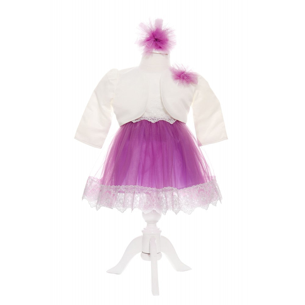 Rochita este realizata cu volane si aplicatii din dantela alba. Sistem de inchidere cu fermuar. Aceasta este accesorizata cu bolero si bentita asortate.