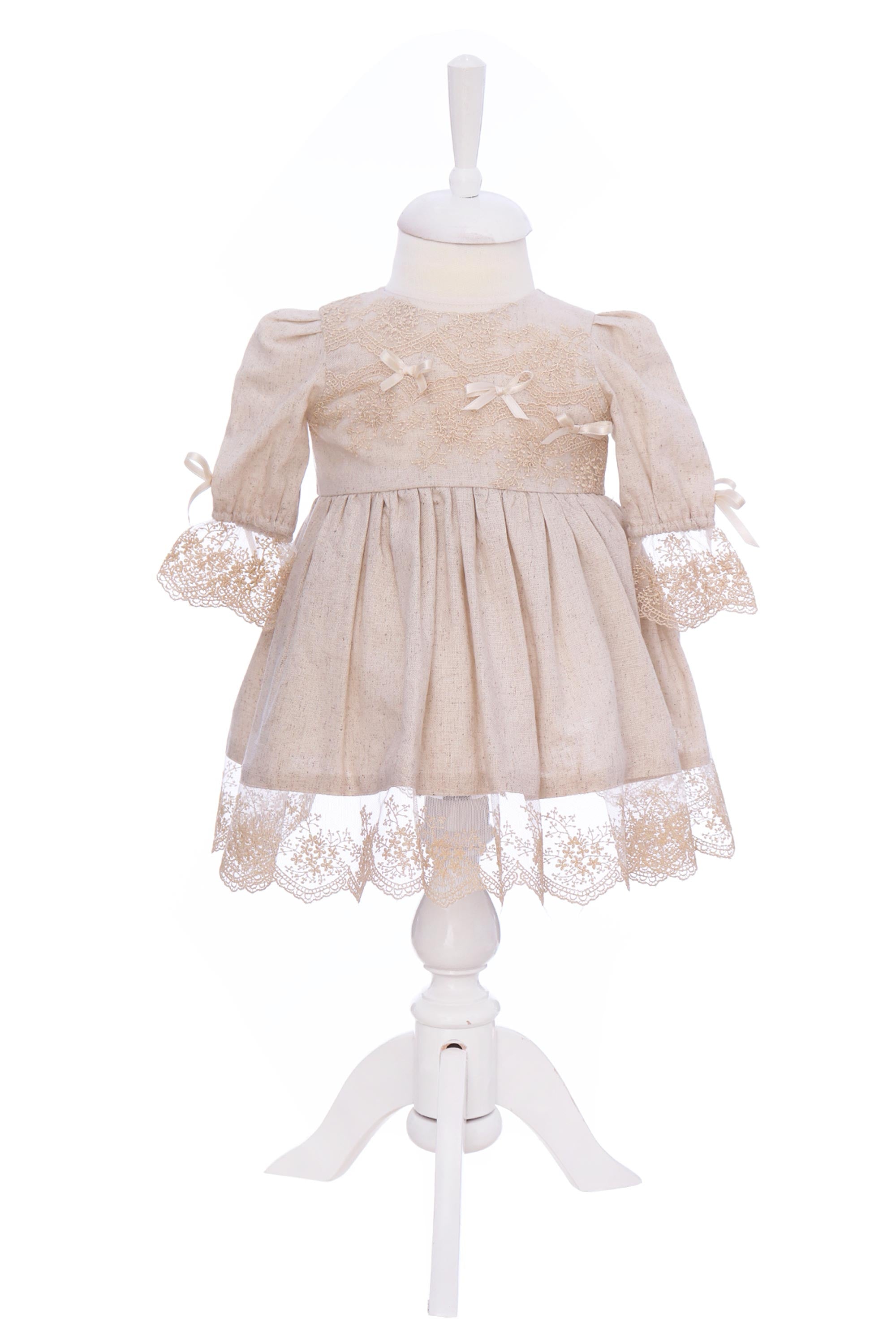 Eleganta atemporala si rafinament delicat se intalnesc in aceasta rochita de botez pentru fetite, inspirata din farmecul victorian. Confectionata dintr-o combinatie de in și dantelă fina, rochita îmbina perfect simplitatea materialelor naturale cu detalii romantice si sofisticate.