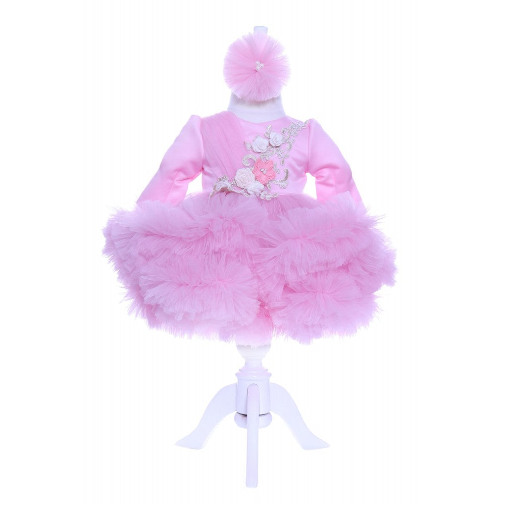 Rochie roz cu volanase si broderie aplicata pentru botez, 2 piese, rochie si bentita, Recostore, REC1686