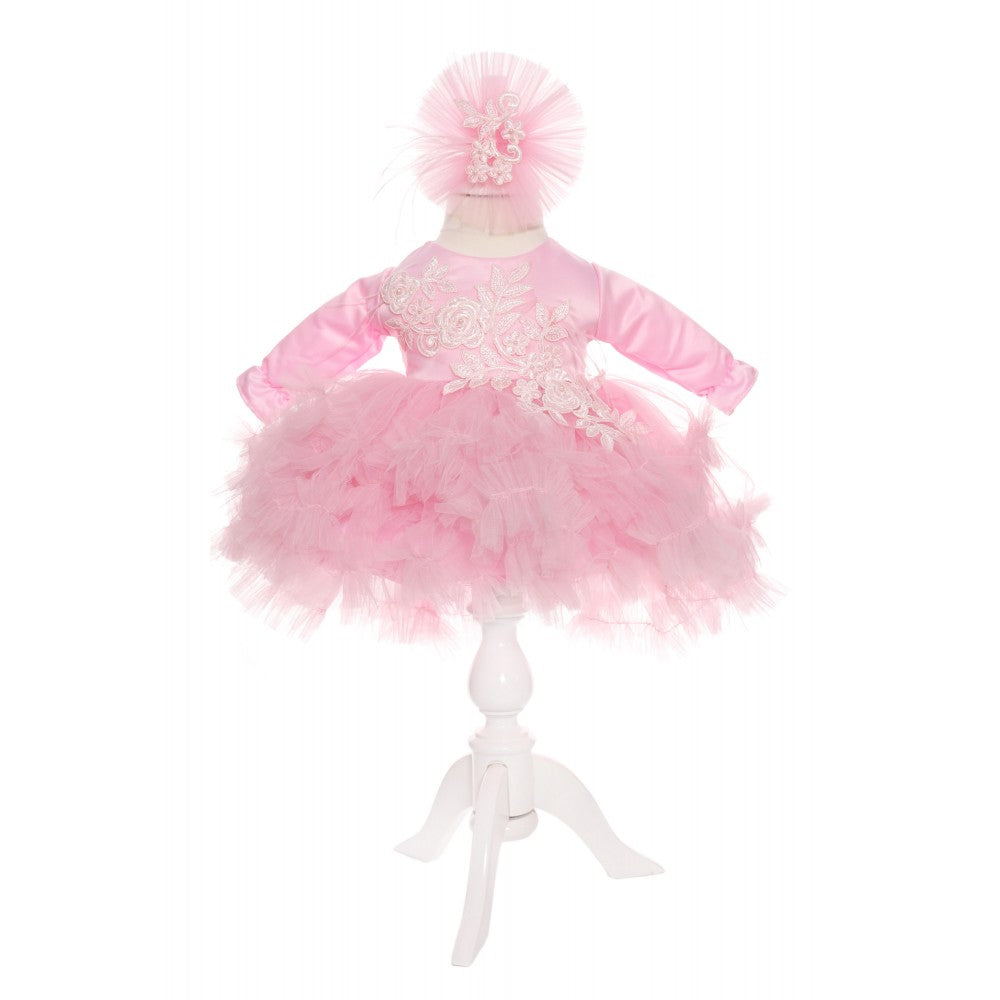 Rochie eleganta roz, accesorizata cu pene si brau din perlute. Este confectionata din material satinat si tull. Este o rochie diafana si are ca sistem de inchidere fermoar la spate. Bentita este un accesoriu indispensabil oricarei domnisoare si este asortata cu rochia.Rochia este una de efect si poate fi purtata la orice ocazie speciala cum ar fi botez sau eveniment important.Setul este realizat in Romania.
