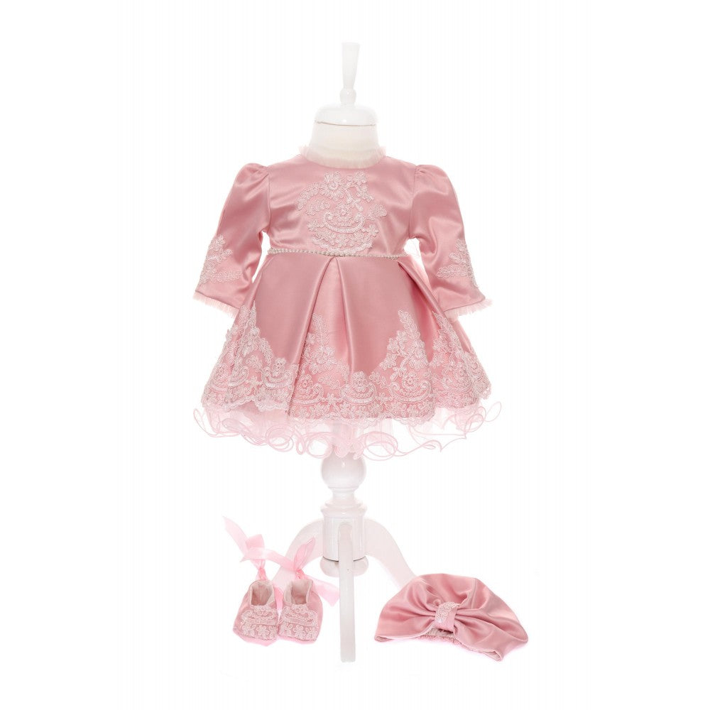 Rochia roz pudrat pentru fetite este confectionata din material satinat la exterior si dublata cu bumbac la interior pentru protejarea pielii fine a bebelusului, este accesorizata cu broderie din dantela si aplicatii. Jupa este realizata din tulle roz pudrat incretit care confera volum fustei.� Se incheie la spate cu fermoar